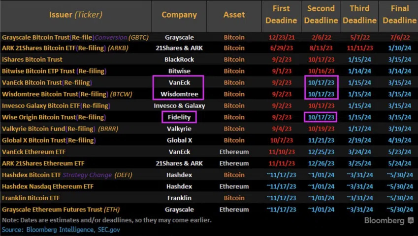 October 17, 2023, will be the second deadline for an SEC mention regarding the applications from VanEck, Wisdomtree, and Fidelity.