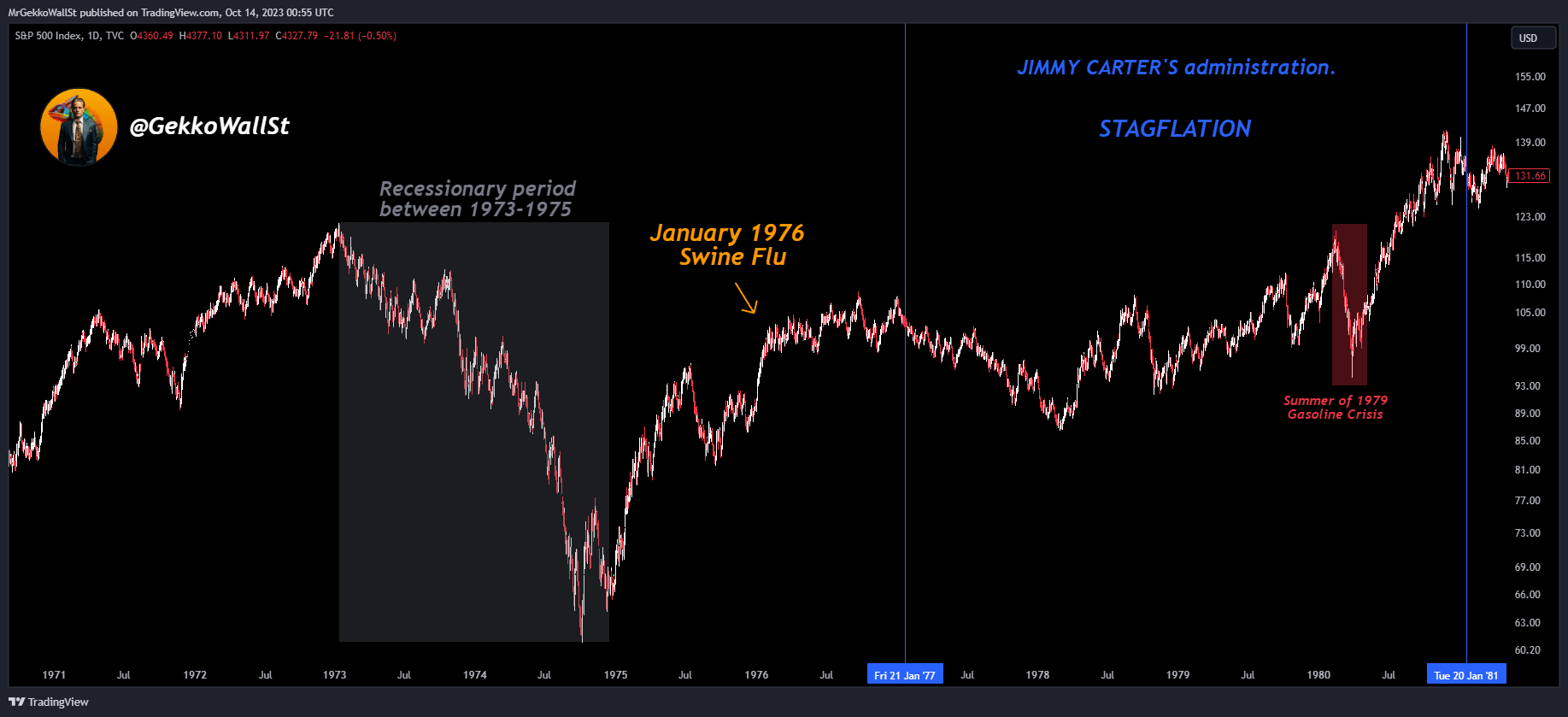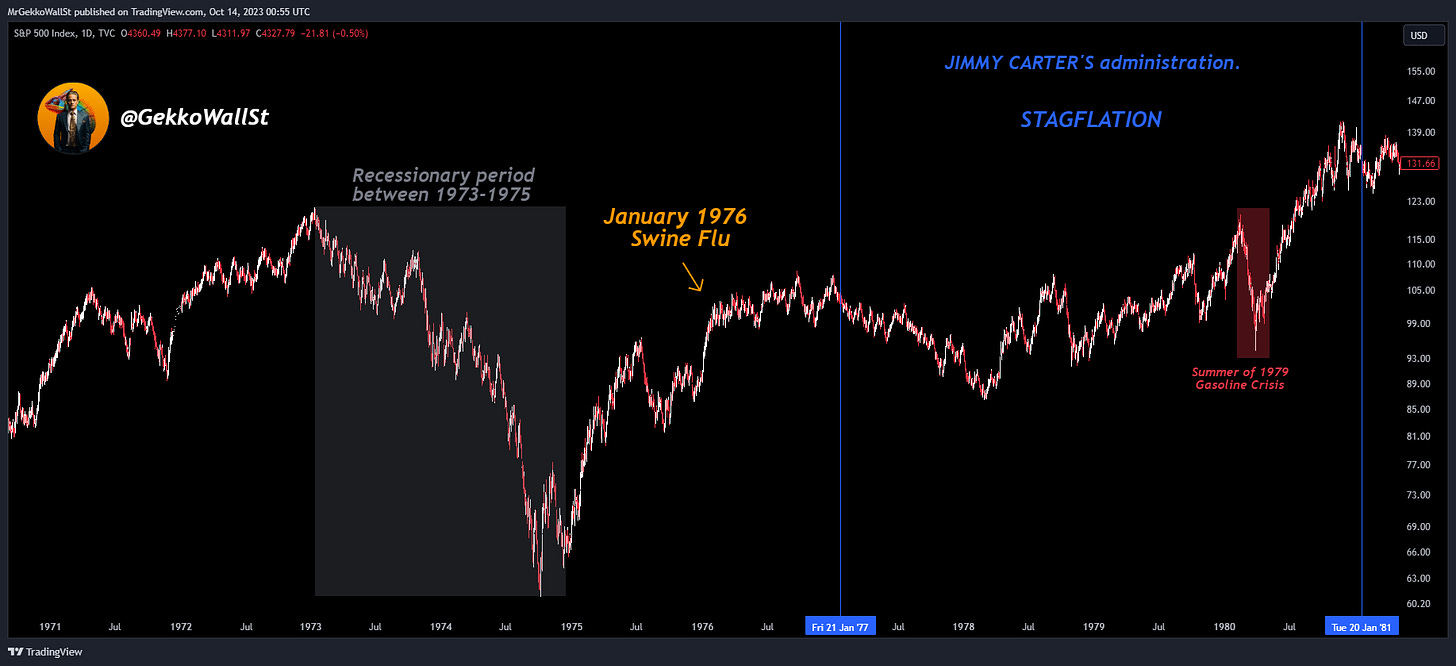 In 1976, Ford faced a swine flu pandemic (the H1N1 variant began infecting humans in the early 1970s). Years later, Jimmy Carter's presidency had an economic history of roughly two equal periods.